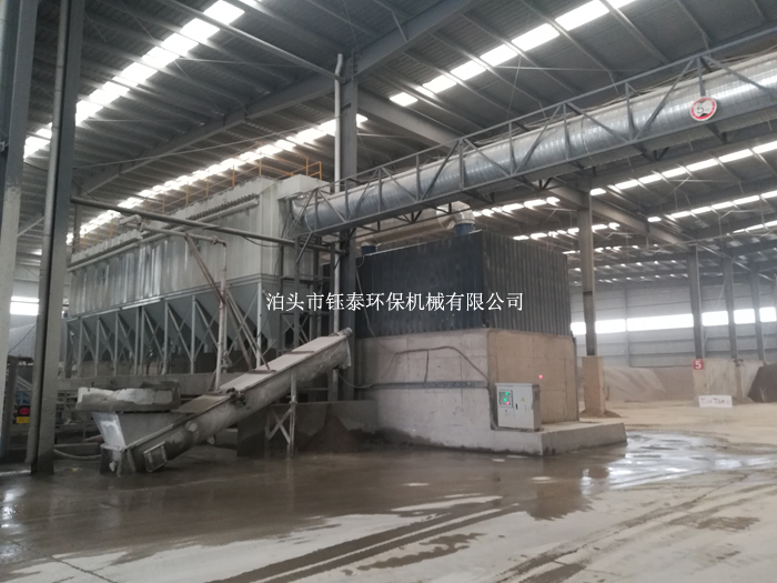 脈沖除塵器定時清灰,清落的粉塵由回粉螺旋送至干燥滾筒進料皮帶,重新回收利用。